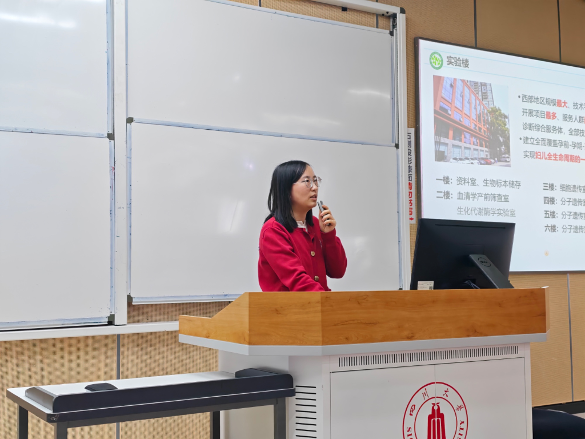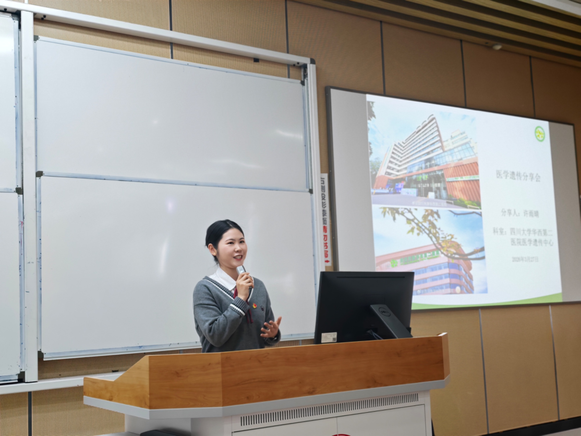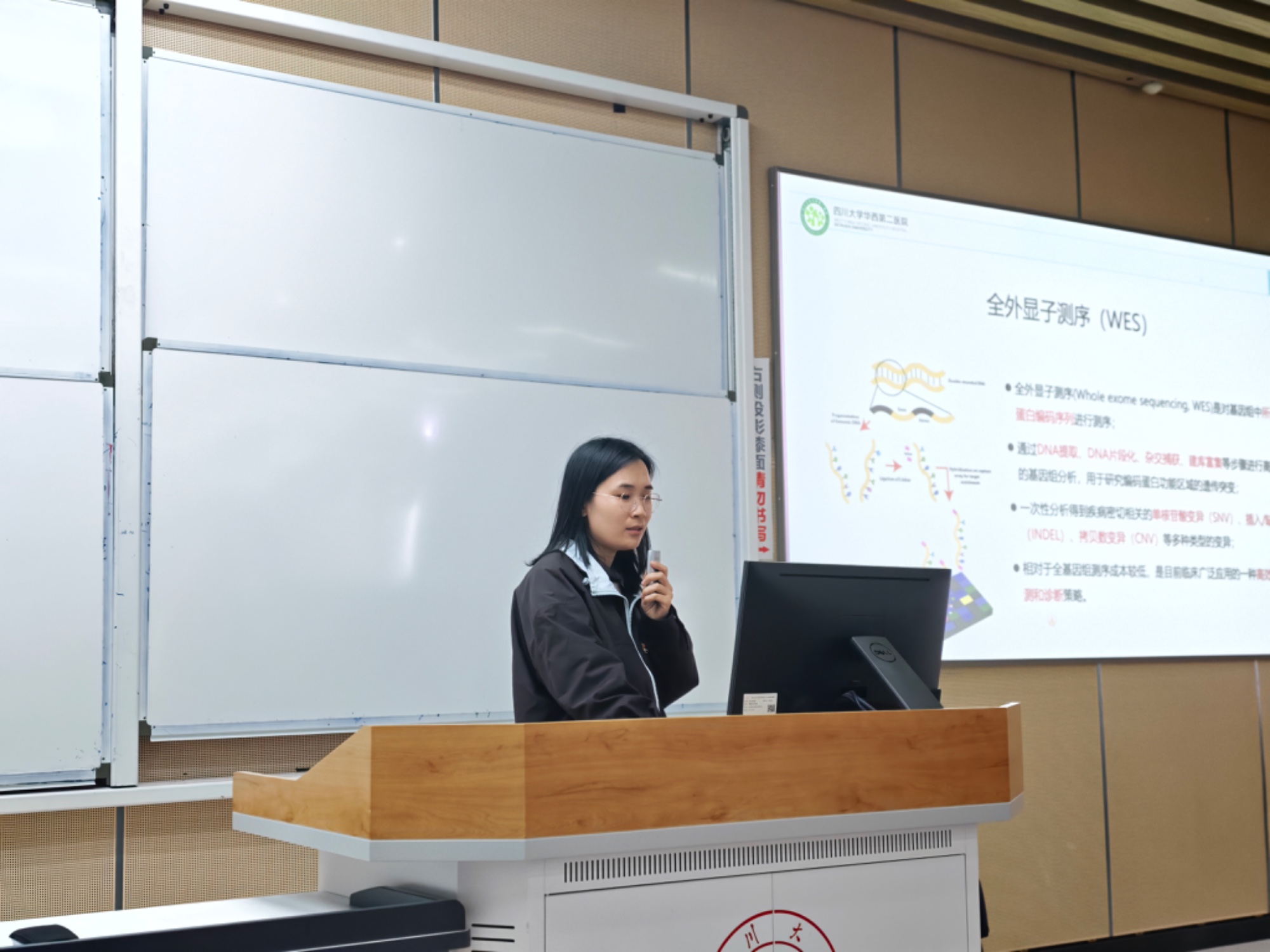 活动中,王莉副主任技师介绍了华西二院及医学遗传中心的基本情况,围绕中心发展概况、师资队伍以及各位老师的基本情况和科研方向进行了系统讲解,使同学们对中心的平台建设、研究特色和发展方向有了较为全面的认识。全外显子测序组组长肖园园副主任技师介绍了全外显子组测序相关内容,并结合组内老师的基本情况及科研方向,帮助同学们对这一技术手段及其在医学遗传学研究中的应用形成初步了解。通过交流,同学们进一步认识到医学遗传学在基础研究与临床实践中的重要意义。