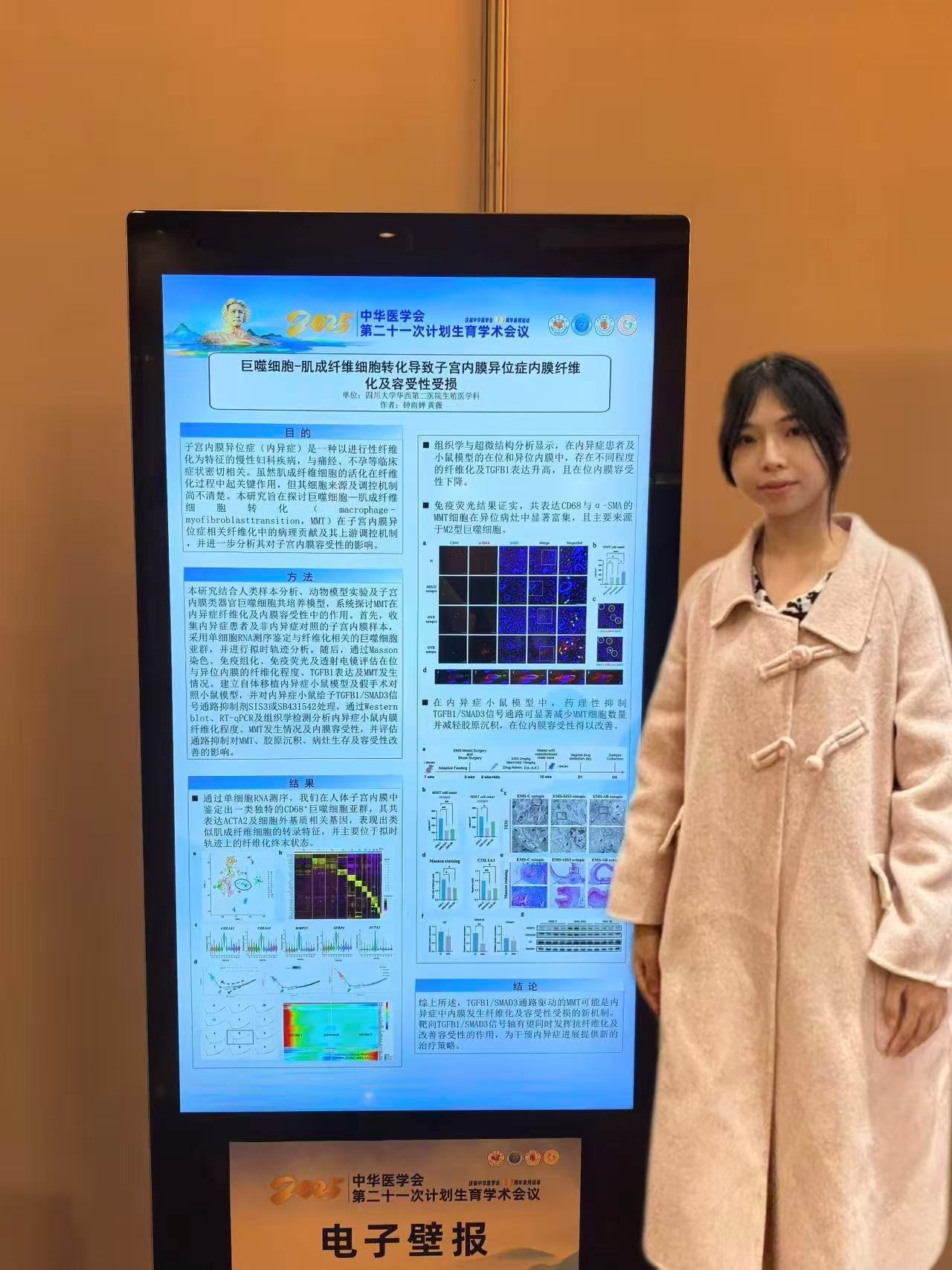黄薇教授《PCOS代谢紊乱对生育的影响》的专题报告系统阐释代谢紊乱对PCOS患者排卵、妊娠的不利影响,并提出针对性干预策略。朱慧莉教授担任分会场主持。研究生钟雨婵论文《巨噬细胞-肌成纤维细胞转化致子宫内膜异位症纤维化及容受性受损》入选大会壁报交流,体现青年科研实力。